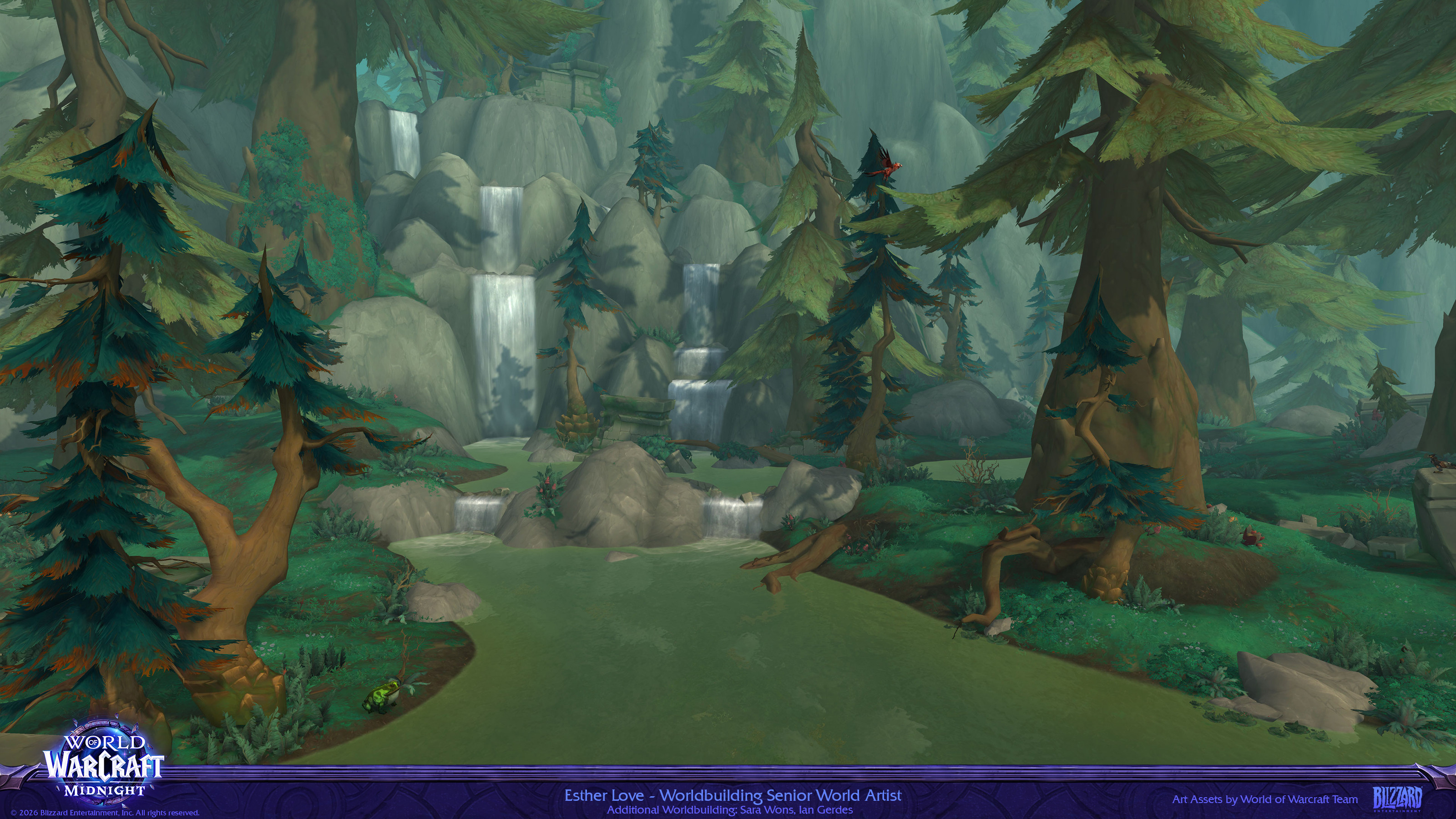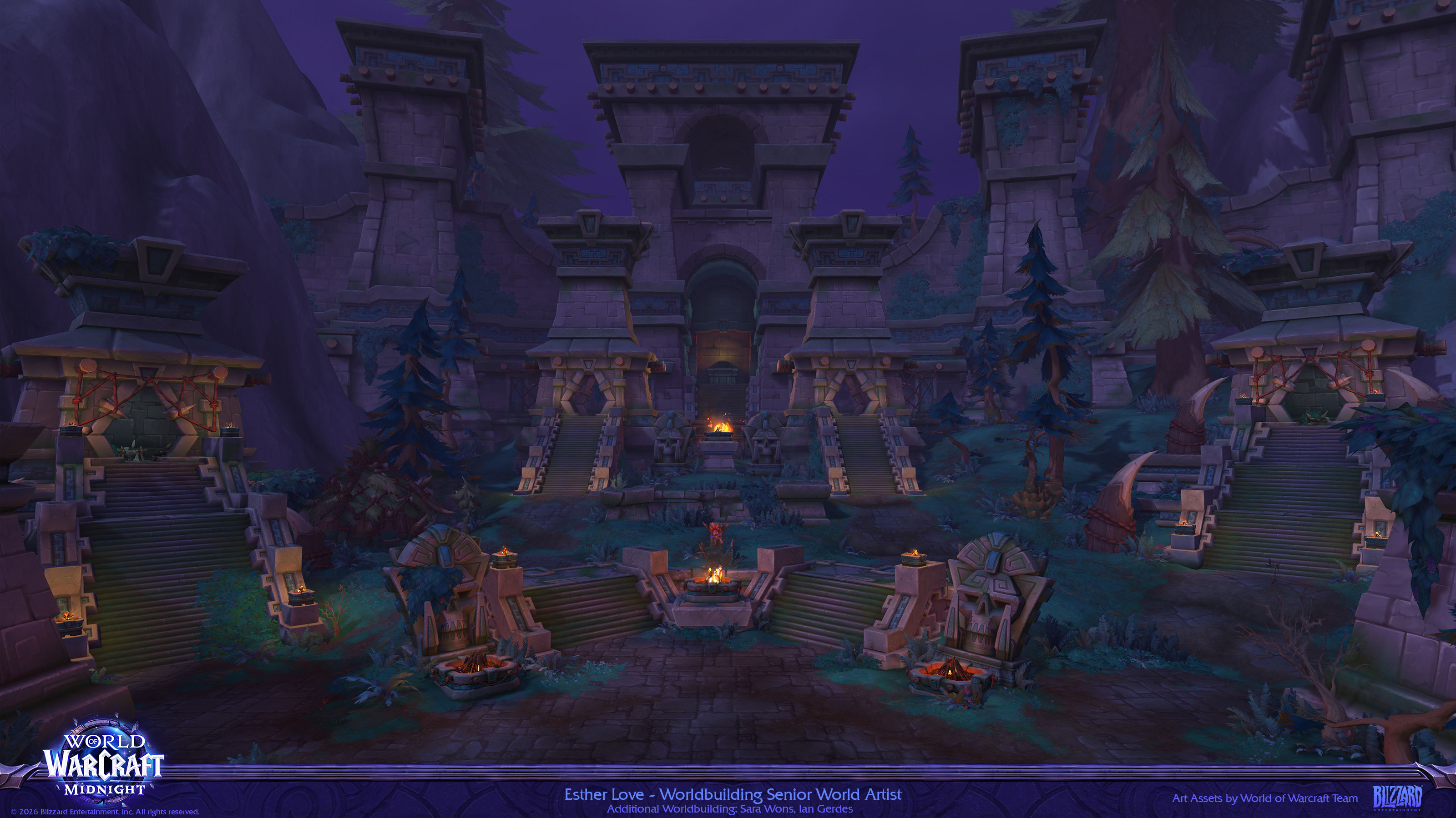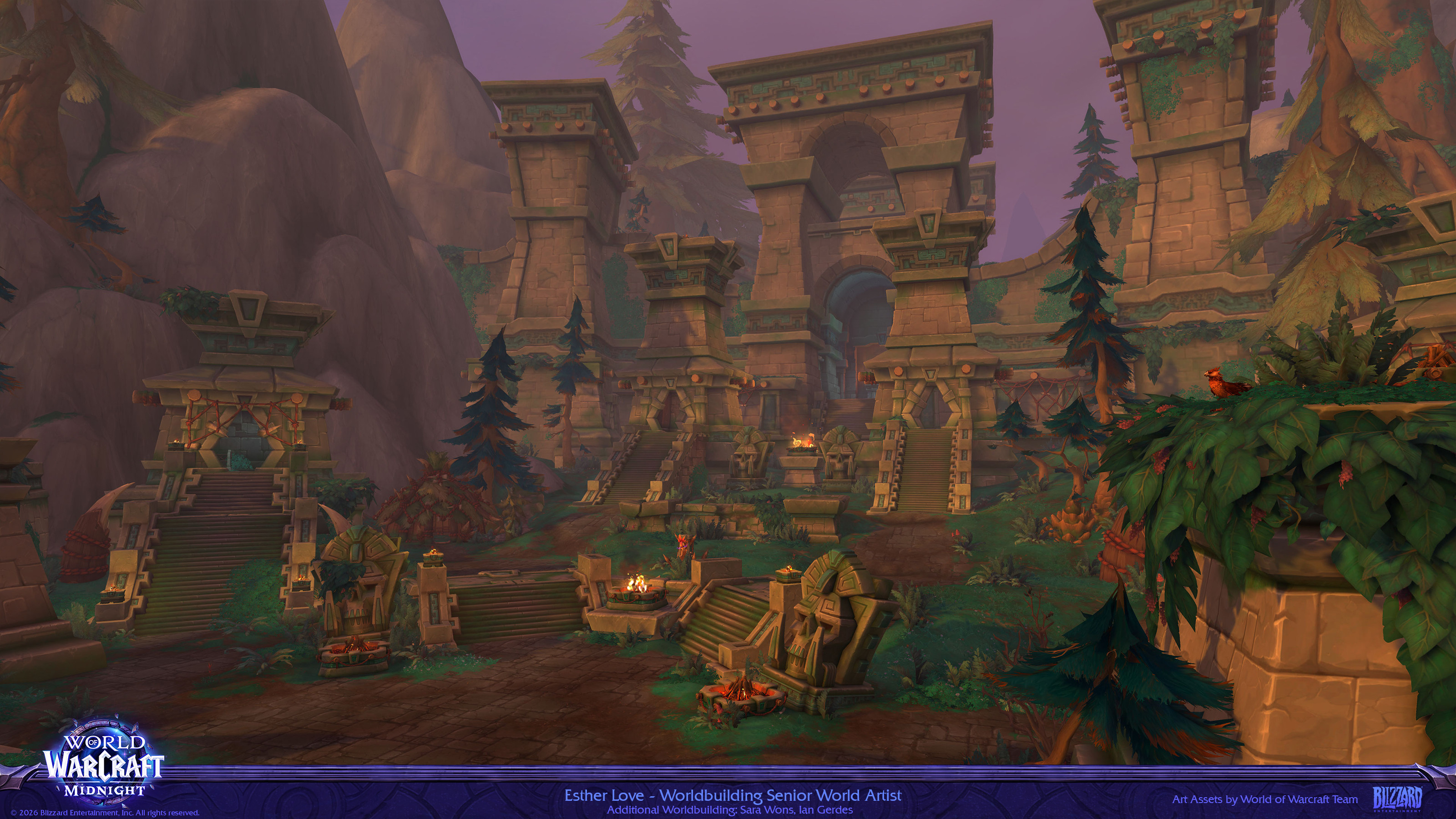 I worked on the Blood Elf camp by the tower up to the central area in front of the gate and the nature spaces around it. I also created what the Zul'Aman biome looks like when it blends across the mountain and into the Eversong forest.