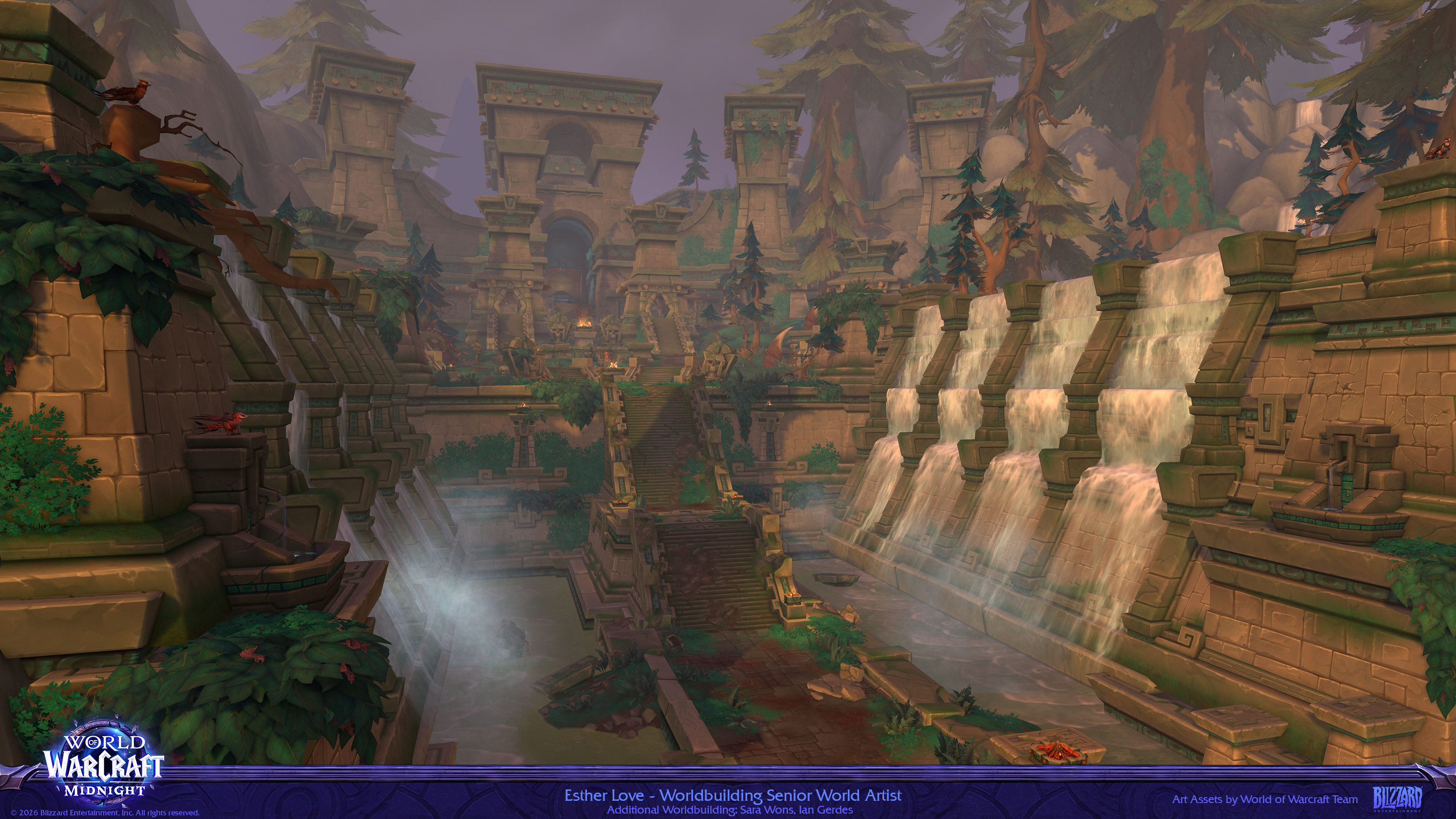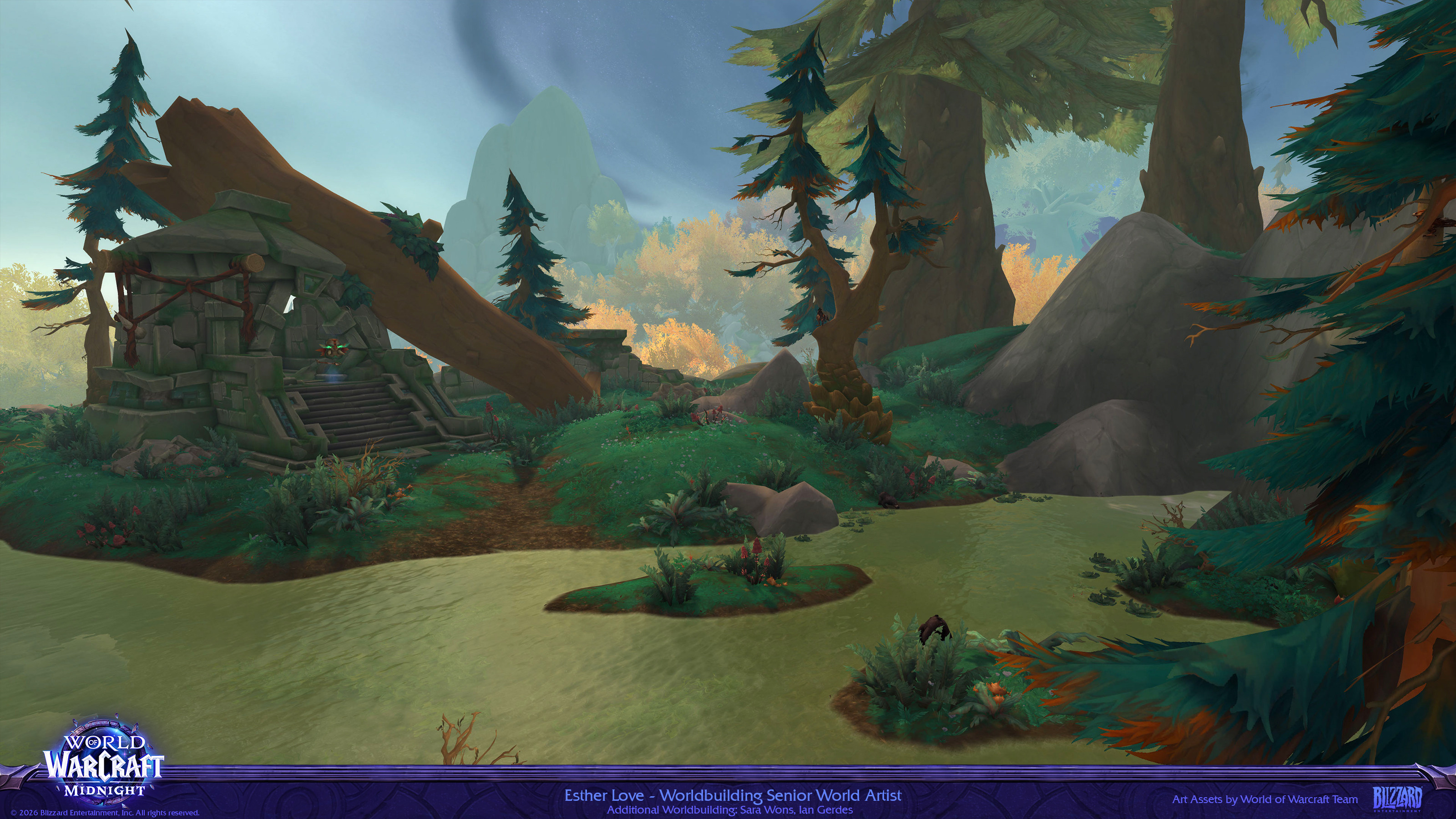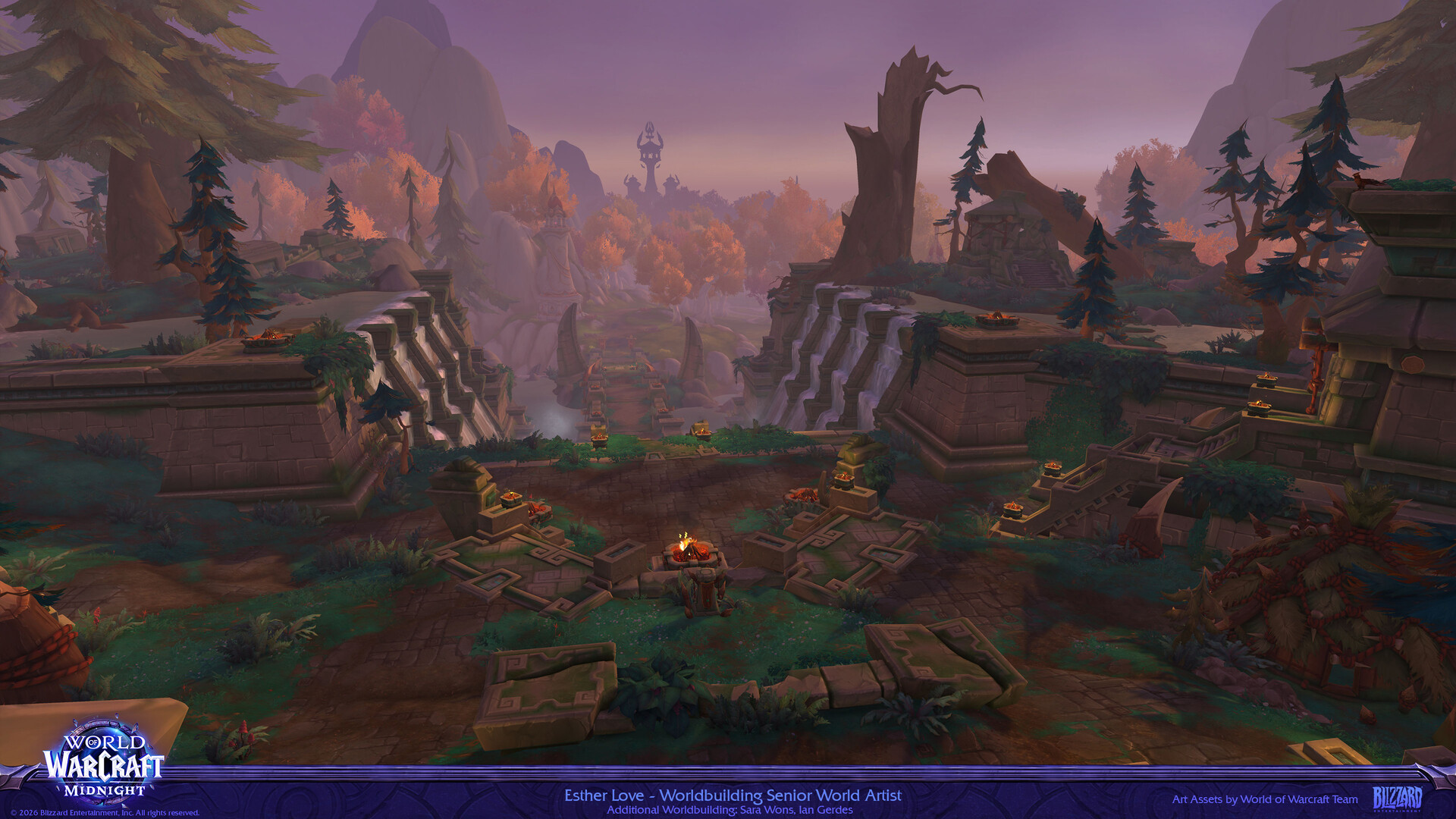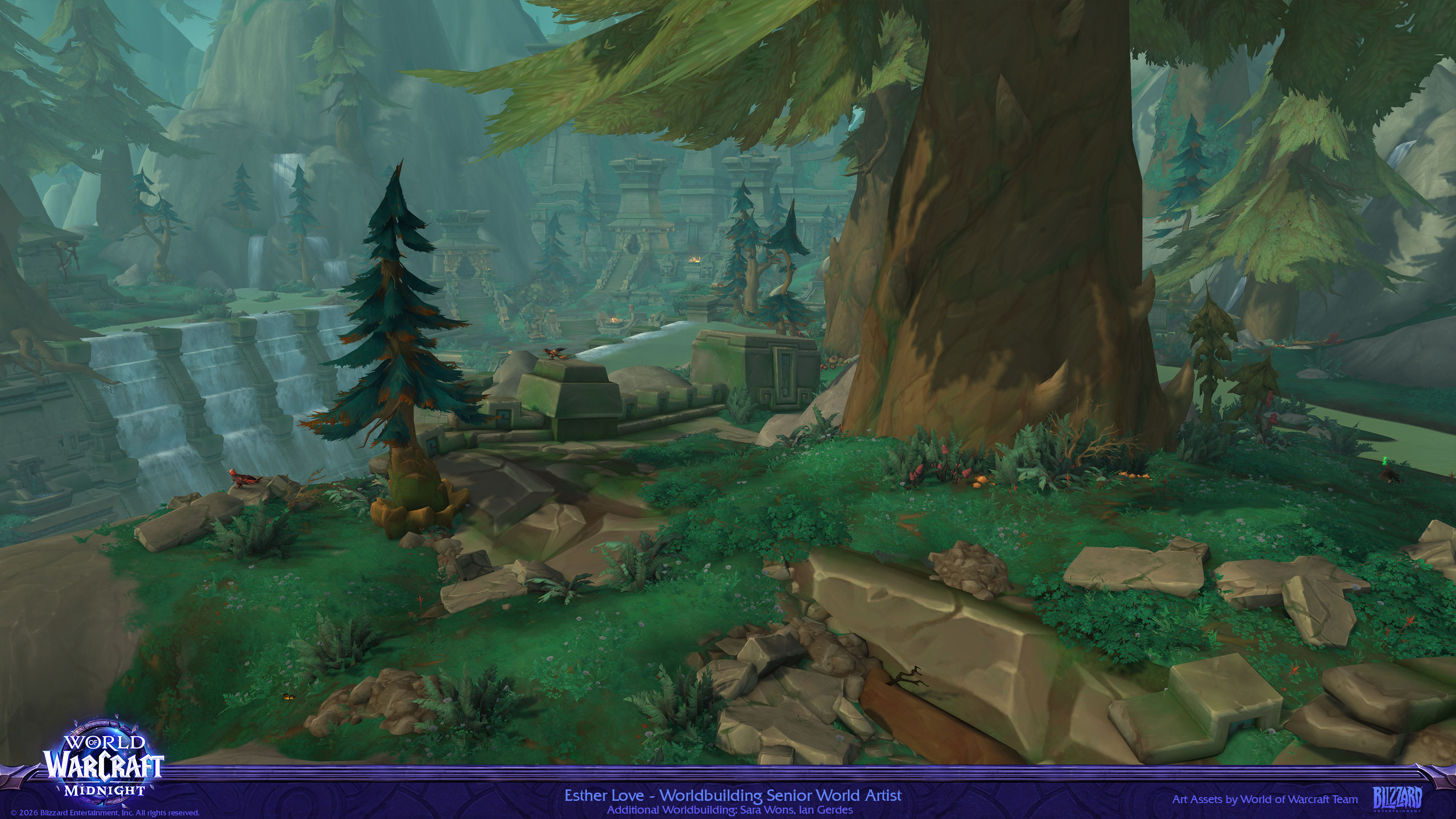 I worked on the Blood Elf camp by the tower up to the central area in front of the gate and the nature spaces around it. I also created what the Zul'Aman biome looks like when it blends across the mountain and into the Eversong forest.